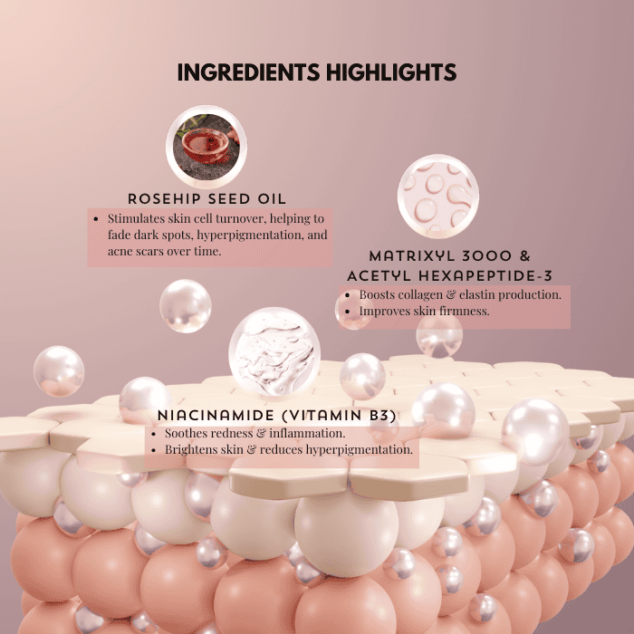 Unveil your skin’s natural glow with Radiance Serum, a powerhouse formula designed to promote collagen production, brighten skin, and reduce redness & scarring. Infused with Matrixyl 3000, Acetyl Hexapeptide-3, Rosehip Seed Oil, and Niacinamide (Vitamin B3), this advanced serum works to improve skin elasticity, even out skin tone, and calm irritation for a smoother, more youthful complexion.