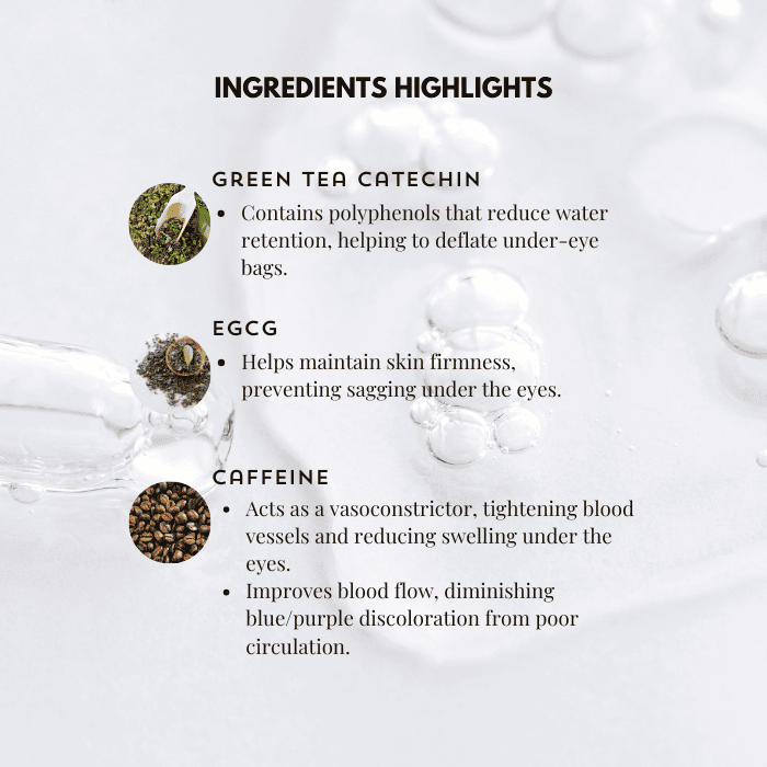 Water, Caffeine, Maltodextrin, Glycerin, Propanediol, Epigallocatechin Gallatyl Glucoside, Gallyl Glucoside, Hyaluronic Acid, Oxidized Glutathione Melanin, Glycine Soja (Soybean) Seed Extract, Pentylene Glycol, Hydroxyethylcellulose, Polyacrylate Crosspolymer-6, Xanthan Gum, Lactic Acid, Dehydroacetic Acid, Trisodium Ethylenediamine Disuccinate, Propyl Gallate, Dimethyl Isosorbide, Benzyl Alcohol, 1,2-Hexanediol, Ethylhexylglycerin, Phenoxyethanol, Caprylyl Glycol.