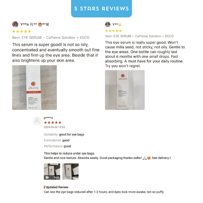 Massage a small amount of the Alluora Caffeine Eye Serum onto the eye in the morning and evening skincare routine.