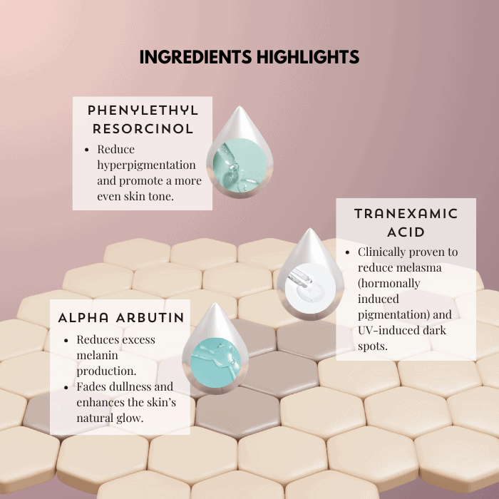 Aqua, Butylene glycol, Glycerin, Panthenol, Alpha-arbutin, Niacinamide, Tranexamic acid, Palmitoyl tetrapeptide-7, 1,2-Hexanediol, Polysorbate 20, Panax ginseng root extract, P-Hydroxyacetophenone, Dipotassium glycyrrhizate, Phenylethyl resorci nol, Bakuchiol, Sodium hyaluronate, Mussel extract.
