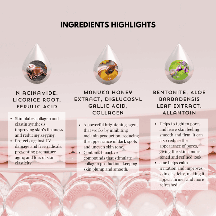 Aqua, Cucumis Sativus (Cucumber) Distillate, Niacinamide, Sodium Polyacrylate, Ethylhexyl Cocoate, PPG-3 Benzyl Ether Myristate, Polysorbate 20, Ascorbyl Glucoside, Butylene Glycol, Phenoxyethanol, Aloe Barbadensis Leaf Extract, Collagen, Titanium Dioxide, Bentonite, Manuka Honey Extract, Allantoin, EDTA, Ferulic Acid, Diglucosyl Gallic Acid, Glycyrrhiza Glabra (Licorice) Root Extract